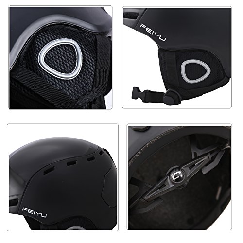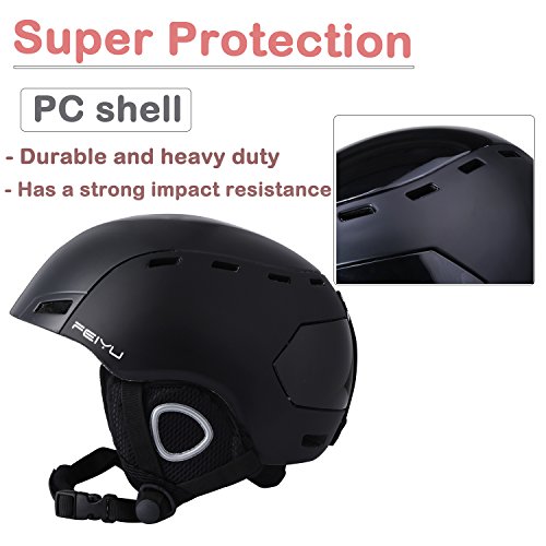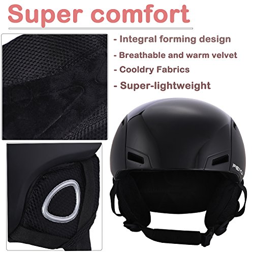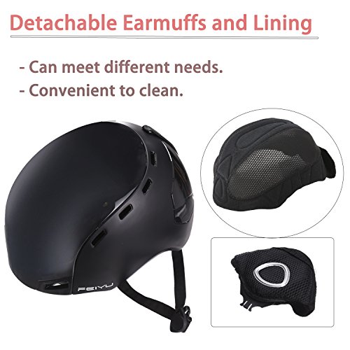 About the Adult Ski Helmet - Super Protection: Durable and heavy duty PC shell, which has a strong impact resistance. - Super Comfort: Integral forming design, breathable and warm velvet inside lining with Cooldry Fabrics, super-lightweight with no pressure. - One Size Fit Most: Dial fit offers enough adjustability for larger or smaller heads. Head circumference: 22-24inch /56-61cm. Side strap adjusters assist with a proper fit. - Detachable earmuffs and lining: Removable earmuffs can meet different needs, also convenient to clean. - Super Fashion: Professional luxurious ski helmet with contrast color is a superior alternative for skateboard, skiing, snowboarding. -Package Include:1 x Adult Helmet