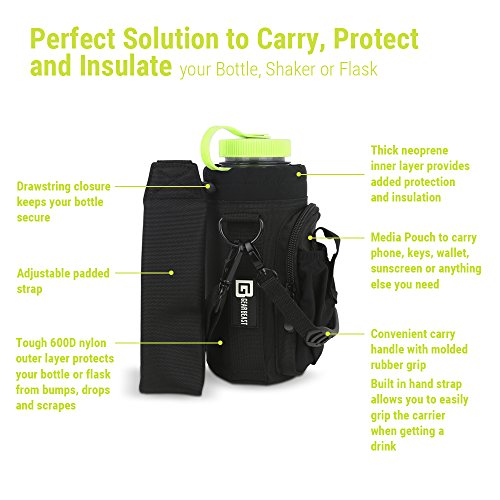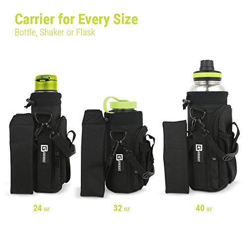 PORTABLE AND HANDSFREE Gear Beast Water Bottle Carrier features an adjustable padded shoulder strap and reinforced hand strap with padded grip to provide a secure and convenient way to carry your flask, growler or water bottle. Great for camping, hiking, biking, boating, going to the beach, working out or any other activity when you want to stay hydrated. Available in 24,32,40 ounce sizes PROTECTS AND INSULATES The Military Grade multi-layer construction of the carrier serves to protect and insulate your flask or bottle. The tough 600D Nylon outer layer protects your bottle front dents, dings and scratches while the padded neoprene inner pouch insulates and cushions your bottle. DRAWTSRING CLOSURE makes sure bottle is securely held in place. TWO POCKETS FOR STORAGE LARGE ZIPPER POCKET perfect for wallet, keys, sunscreen, credit cards, ID, lip balm or smartphone including iPhone X, 8, 8 Plus, 7, 7 Plus, 6s, 6s Plus, 6, 6 Plus, Galaxy Note 8, 5, 4, S8, S8 Plus, S7, S7 edge, S6, S6 edge and others. QUICK ACCESS POCKET allows you to store items that you want to grab on the go. It is great for snacks such as Protein Bars / Pouches, Granola Bars, Fruit and even accommodates phones with protective cases. MULTIPLE CARRYING OPTONS: LONG PADDED ADJUSTABLE SHOULDER STRAP is perfect length for adults and children of all sizes. Don't want to carry your bottle by hand or over your shoulder? BOTTLE HANDLE is great for carrying the bottle by hand and can be detached on one end and clipped to a backpack, laptop bag or wherever else you need it. SIDE HAND STRAP allows you to easily to hold your bottle while taking a drink. PERFECT FOR WATER FLASKS AND BOTTLES FROM ALL BRANDS including Hydro Flask, Swell, Contigo, Camelbak, Yeti. Avex, Klean Kanteen, Sigg Thermo, Miir, Thermos, Polar, Stanley, Nalgene and More 0 |