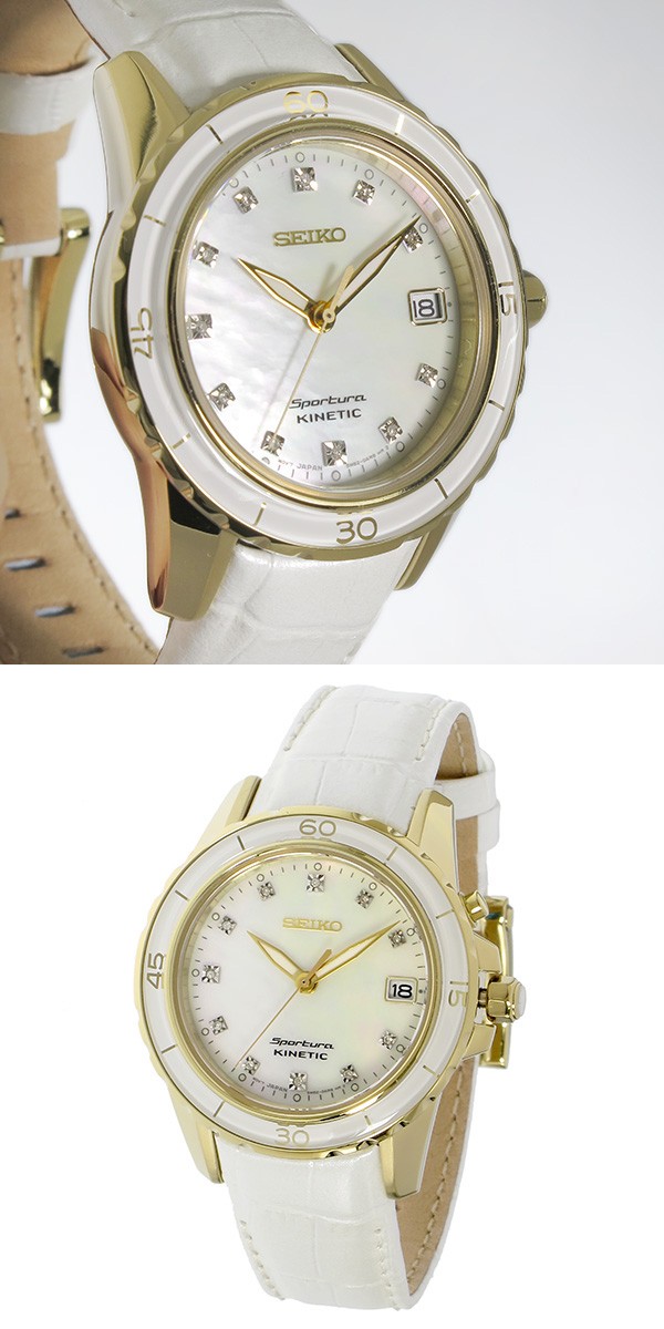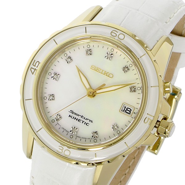 セイコー SEIKO スポーチュラ キネティッククオーツ レディース ウォッチ 時計 シェルホワイト  商品仕様:(約)H37×W37×D11mm(ラグ、リューズは除く)、重さ(約)62g、腕周り最大(約)17cm、最小(約)13.5cm ステンレス(ケース)、レザー(ベルト) BOX、保証書、取扱説明書