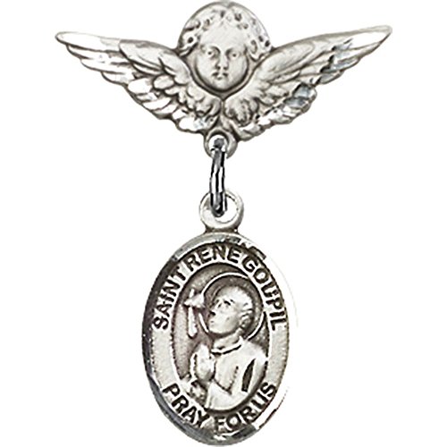 -. Title : Sterling Silver Baby Badge with St. Rene Goupil Charm and Angel w/Wings Badge Pin 7/8 X 3/4 inches