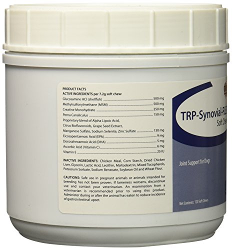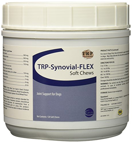 -. Binding : Misc. -. Brand : Sogeval -. EAN : 0813471015356 -. Feature : Tasty Chews / Helps relieve pain in the hips and other joints / If your dog is experiencing joint pains, give them a chew either before or after exercising -. Label : Lambert Vet Supply -. Manufacturer : Lambert Vet Supply -. Model : FNGL9002120 -. MPN : FNGL9002120 -. NumberOfItems : 1 -. PackageQuantity : 1 -. PartNumber : FNGL9002120 -. ProductGroup : Pet Products -. ProductTypeName : PET_SUPPLIES -. Publisher : Lambert Vet Supply -. Studio : Lambert Vet Supply -. Title : Sogeval TRP-Synovial-Flex Soft Chews for Dogs, 120 Ct -. UPC : 813471015356