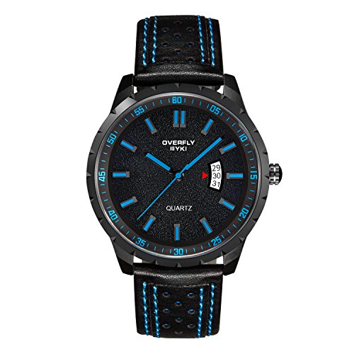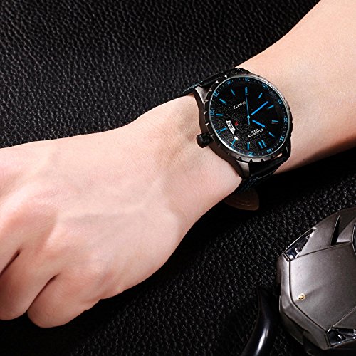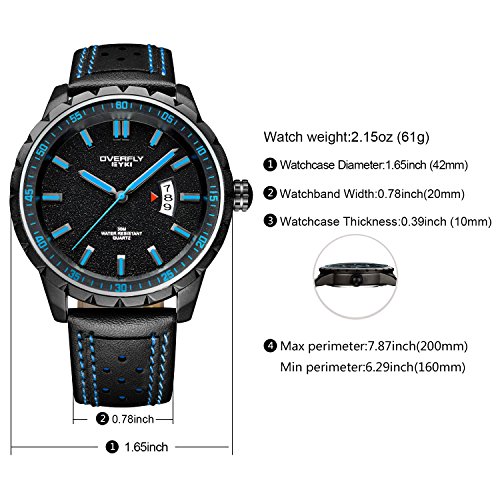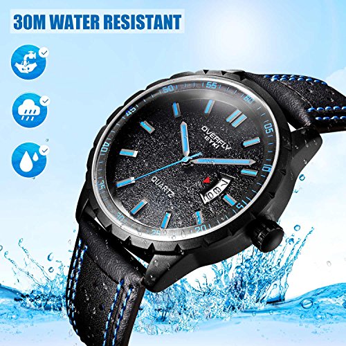 -. Feature : FEATURES of this CASUAL WATCH : clear time showing, accurate time keeping, auto calendar, 30M water resistant, super soft wearing, unique genuine leather watch band / FASHION WATCH DESIGN: Round black analog display dial featuring blue slender stick hour markers and long hands, Arabic numeral minutes markers circling in the outer rim, auto calendar display at 3 o'clock position. Time and date are easy to read / HIGH QUALITY WATCH MATERIAL: Precise Japanese quartz movement, two year life battery, key scratch resistant mineral glass, super soft leather band, stainless steel back cover and buckle. Good material makes up good watch for male / COMFORTABLE MAN WATCHES: 20mm genuine leather strap is super soft and easy to adjust, the flat back cover will not hurt your skin or clothes at any case. A soft wearing experience is waiting for you / 30M WATER RESISTANT WATCH: 3ATM(99 FEET) waterproof, daily use like splash, rain, hands washing are NO PROBLEM, NOT suitable for bath, swimming or long time water-related work, please DO NOT pull the crown in water