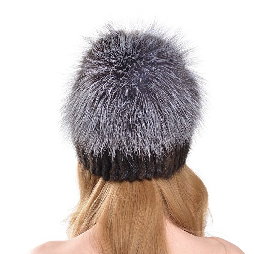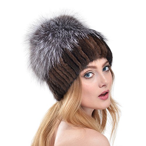 Title : Queenfur Genuine Knit Mink Fur Hat Natural Silver Fox Fur Top Beanie Winter Fur Cap (Coffee)