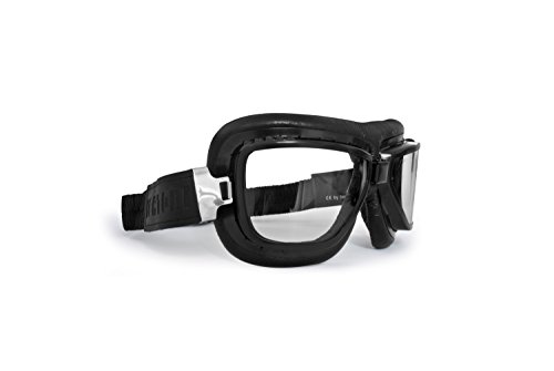 -. Feature : Font frame in black with mat black steel profiles - Can be used in conjunction with sunglasses or spectacles / Clear lens in anticrash polycarbonate 2,4mm.- Antifog coating - Wide peripheral vision / The strap is covered and embellished by black silk / The High quality adjustable elastic strap gives a close fit with any open face helmet / Anti-misting aerators - Vintage goggles for and choppers