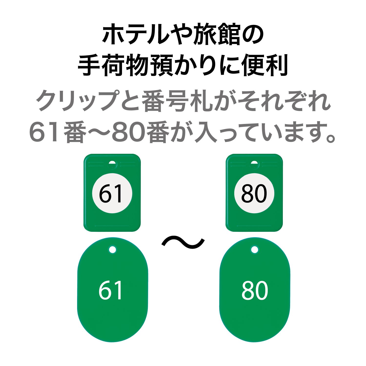 【本体サイズ】W33×D46×H27mm(クリップ) W40×D60×H2.7mm(番号札) 【材質】ABS(クリップ) 再生PS(番号札) 【内容】20組セット 61~80番 【生産国】日本