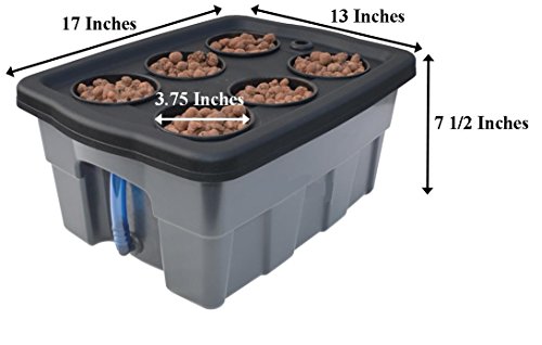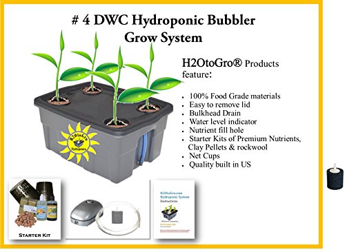 -. Brand : H2OToGro -. Color : Black lid with gray bin, -. Feature : Complete growing kit, even includes starter packs of nutrients & grow mediums to get you started! Just add sunshine. / Oxygenation ~ Provides plants with highly oxygenated and nutrient enriched water that circulates below the plants for the best results and minimal effort. This oxygenation helps increase plant growth and speeds plant development. Plants can grow faster and larger in a DWC Hydroponic system compared with soil grown plants. / Made with 100% Food Grade Polyethylene! / Perfect for school projects or science experiment! / Water level indicator ~ Helps maintain the proper water level in the reservoir without lifting or removing the lid. The blue color helps inhibit algae growth. -. Label : H2OtoGro -. Manufacturer : H2OtoGro -. MPN : 04043.75Bub -. PackageQuantity : 1 -. PartNumber : 04043.75Bub -. ProductGroup : Lawn & Patio -. ProductTypeName : SEEDS_AND_PLANTS -. Publisher : H2OtoGro -. Studio : H2OtoGro -. Title : Complete Hydroponic system DWC BUBBLER Kit # 4-4 by H2OtoGro
