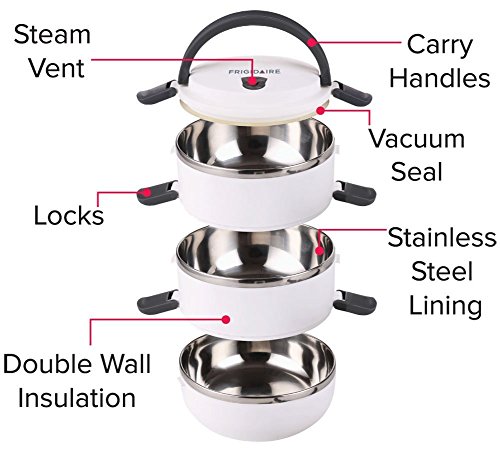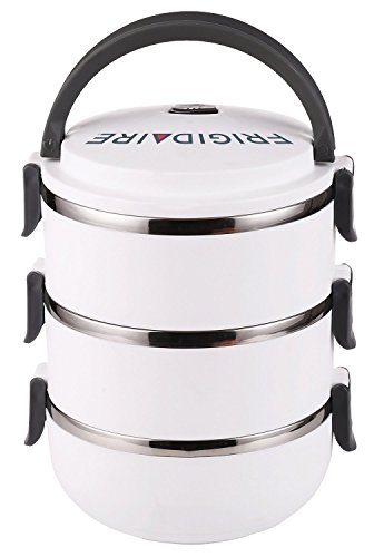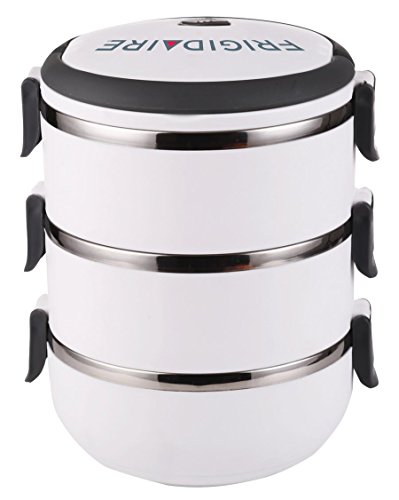 Frigidaire 3 Tier Bento Box Beautifully designed triple-decker stackable bento/tiffin boxes are ideal for providing variety in school or work/office lunches. No longer restricted to a plain sandwich, you can really provide for your family's dietary needs with healthy foods and endless options. These tiffins are dishwasher safe, and the stainless steel interior helps keep the food fresh. Just pop the food into the tiffin, the tiffin into your bag, and enjoy a delicious healthy mid-day meal. Perfect for people who are watching their weight but don't want to be stuck with the same old foods every day.
