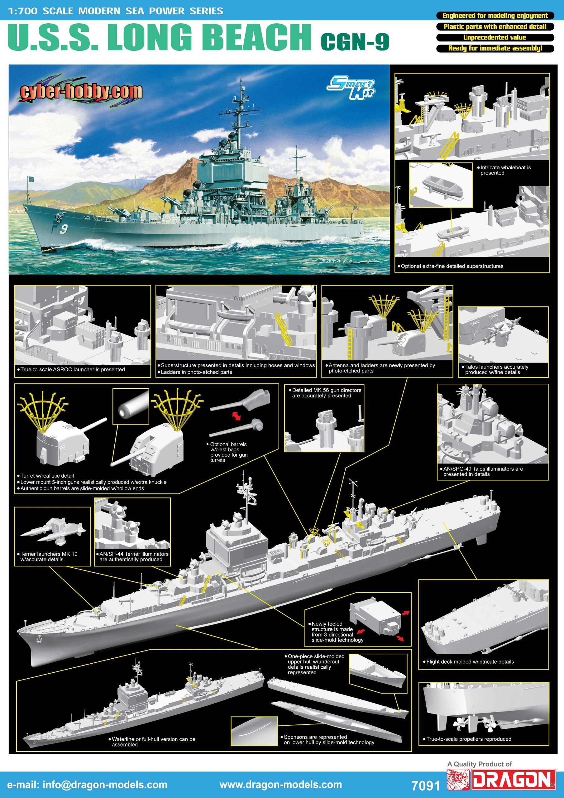A kit of the US Navy nuclear missile cruiser with a new mold Kit precisely reproduces Long Beach which is the last long hull cruiser precisely Box shaped bridge also precisely reproduces the 38 bore 5 inch gun antenna and mast etc