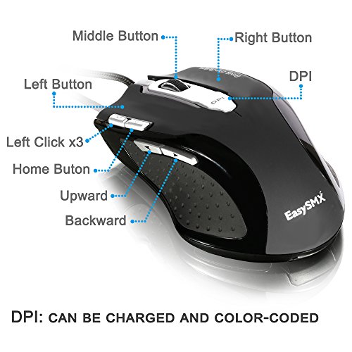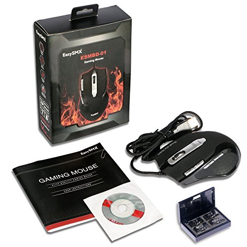 -. Feature : EasySMX Laser Gaming Mouse is designed to perfect your gaming experience by packing high precision, advanced customization options, ergonomic design and easy. In a words, it provides comfortable feeling and outstanding performance to ensure ultimate gaming experience / The gaming mouse uses a gaming-grade laser to ensure high precision up to 8200 DPI. Adjustable polling rate up to 1000HZ, 10-level scroll wheel speed and 3-level cursor movement acceleration / 7 programmable buttons that you can configure to operate more efficiently during game. Quickly switch DPI levels with a single button located behind the scroll wheel, accompanied by color change of LED backlighting / It comes with a CD driver that is quick and easy to install. After installation you can configure DPI, button commands (macros and combo setting) and other setting. 5 different game profiles can be set and saved / The rubberized and soft-touch coating is given for maximum comfort and every button is carefully positioned to reduce click fatigue. Most importantly, you can load the mouse with a 5g weight and three 10g weights to ensure best balance
