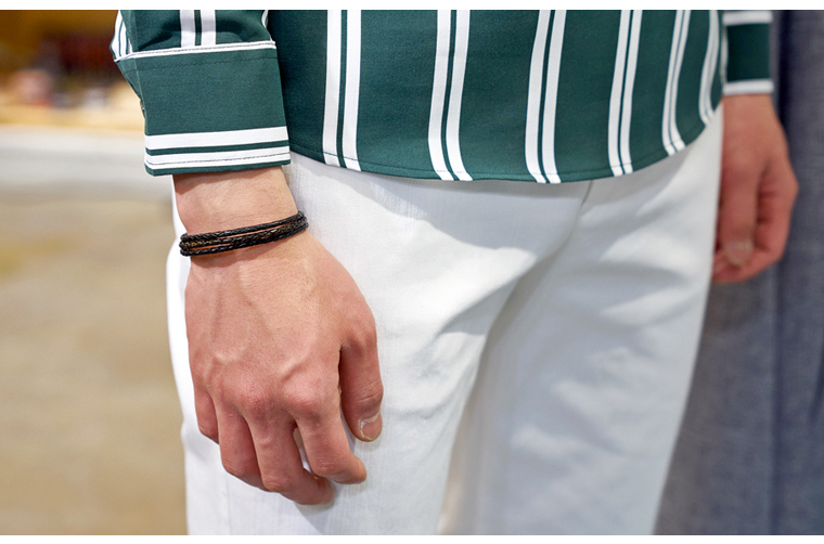 부드럽게 가공된 3가지 컬러의 트위스트 가죽을 믹스해 제작한 팔찌입니다. 고급 스테인레스장식과 이태리 수입가죽을 이용해서 품질을 최대한 올렸습니다. 은은한 톤온톤 컬러의 가죽과 반광 메탈장식이 잘 어우러져 클래식한 느낌을 잘 살려낸가죽팔찌입니다. 스테인레스 장식은 변색이나 알러지 걱정이 거의 없이 오래도록 사용이 가능해 본인 뿐 아니라 선물용으로 사용하시기에 좋습니다. 4계절 착용하기 좋은 디자인으로 캐주얼한 코디는 물론 댄디한 코디에도 잘 어울리는 디자인입니다. 기획가로 제작되어 가성비 좋은 아이템입니다. 남녀공용으로 착용하기 좋고, 사이즈도 남성용, 여성용, 주문제작까지 가능하기 때문에 커플용 팔찌로 추천드립니다.