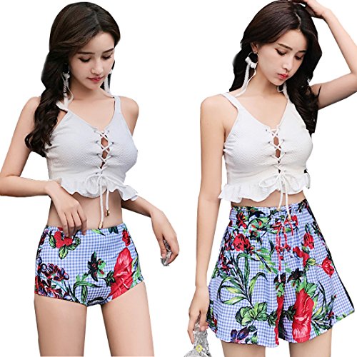 -. Feature : ポエステル18% ポリウレタン82% / 夏らしい 花柄のショートパンツ付きの3点セットビキニ。トップスに無地をあわせたミックスマッチデザインです。 / トップのフロント部分にマクラメ編みを使用しており、シンプルな中にもこだわりの光るアイテムとなっております!!ノンワイヤーなので、アンダーの締め付けも優しいノンストレスタイプ。 / 肩紐にはアジャスターがあるのでサイズの調節も出来ます。ブラの周りは自分のサイズによってフロントの紐で調節できて、胸をきれいに寄せてくれる。 / フレアーのデザインでウエスト周りをスッキリ見せる効果もあります。ハイウエストのボトムと合わせて、女性の最も細い部分を際立ってくれて、着やせ効果があります。
