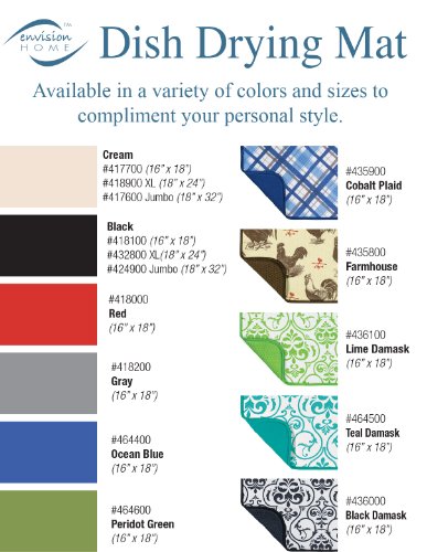 Studio : Schroeder Tremayne, Inc. Publisher : Schroeder Tremayne, Inc. Binding : Misc. Product Description The Envision Home Dish Drying Mat Jumbo is the new solution to the age old tradition of placing dish towels on the counter when hand-washing pots, pans, dishes, and glassware. Often imitated, but never duplicated, our Dish Drying Mat Jumbo features a center layer of foam that is fused to revolutionary, super-absorbent microfiber fabric using our proprietary manufacturing process. This process yields a mat that is highly functional and incredibly durable, use after use, wash after wash. By combining an optimal foam thickness with uniquely woven microfiber fabric, water quickly radiates from the point of contact, enhancing absorption and quickening drying time. You will be amazed by the effectiveness and convenience of this deceptively simple item! The Envision Home Dish Drying Mat Jumbo is perfect for use underneath a dish rack to catch drips or you can place pots, pans, and glassware directly on the mat. At a size of 18 in. x 32 in. the Dish Drying Mat Jumbo covers an impressive 4 square feet of counter space, making it the ideal choice for drying dishes after entertaining. When not in use, the Dish Drying Mat Jumbo easily folds for convenient storage.Available in a neutral Cream, the Envision Home Dish Drying Mat Jumbo will compliment any style. Plus, the Dish Drying Mat Jumbo comes with a sewn-in twill corner sash allowing for convenient hanging when drying or storing.Caring for your Dish Drying Mat Jumbo is easy; simply toss it in the washing machine with cold water and a liquid detergent and then place in the dryer on a low heat setting. The Dish Drying Mat Jumbo is just one of the many impressive items offered in the Envision Home Collection. Designed to make it easier to take care of the home, our innovative, high-value and superior-quality products provide cleaning, kitchen, bath, laundry and pet solutions to solve life’s little dilemmas. 0