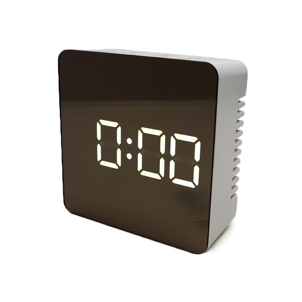 | ミラー画面に時間などが表示される、多機能な置時計。 |