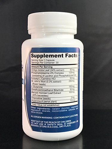 INGREDIENTS: Mental Strength is a careful blend of 9 quality, time-tested ingredients. Each capsule contains Ginkgo biloba Leaf (24% extract), Phosphatidylserine 4% Complex (Consisting of Lecithin and Phosphatidylserine), N-Acetyl L-Carnitine HCl, St John's Wort (0.3% extract), L-Glutamine, Dimethylaminoethanol (DMAE) Bitartrate, Bacopa monnieri Leaf Extract (20% bacosides), Vinpocetine (seeds) and Huperzine-A (aerial plant).