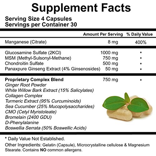 A COMPLETE DIETARY SUPPLEMENT FOR THE JOINTS. Aiding in boosting joint mobility, supporting joint structure, repairing cartilage, increasing joint flexibility, reducing inflammation and protecting joint tissue. Helps to ease the pain and discomforts that come with age, weight or athletic deterioration of the joints in the body. Works for Men Women and Seniors. SPECIFICALLY FORMULATED FOR THE REDUCTION OF ACHES, PAINS, SORENESS AND INFLAMMATION OF THE JOINTS. Includes Glucosamine and Chondroitin complex to help fortify joints in order to help reduce gradual breakdown of cartilage and tissue, while MSM helps enhance the reformation of collagen for prime joint support. LUBRICATES FOR IMPROVED MOBILITY and relief of pain to help act as a lubricator and shock absorber for joints. REGAIN THE ACTIVE LIFESTYLE YOU WANT using a powerful combination of proven, pure ingredients that help build the cartilage that serves as a shock absorber for your joints. ALL NATURAL - MADE IN THE U.S.A. in an FDA-Registered facility. This product is GMP-certified to assure the highest quality and purity. Gluten free, dairy free, soy free, no hormones, no antibiotics, no preservatives, no yeast, no soy, no sugar, no cholesterol, no artificial colors/flavors, no binders.Feature
