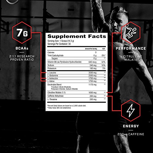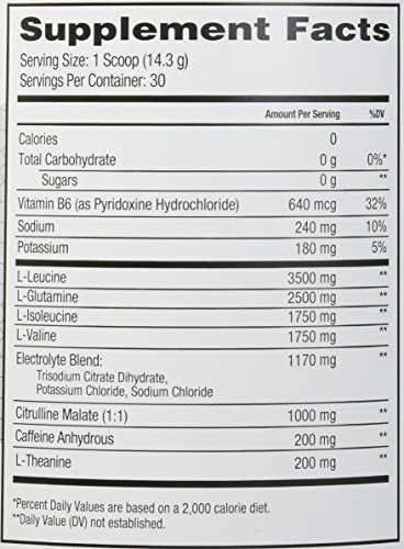 Recommended Use: As a dietary supplement, mix one scoop per 8-16 oz. of water (adjust for taste preferences). Shake well and consume up to two scoops during exercise on training days or between meals on non-training days. For best results, use two scoops per day
