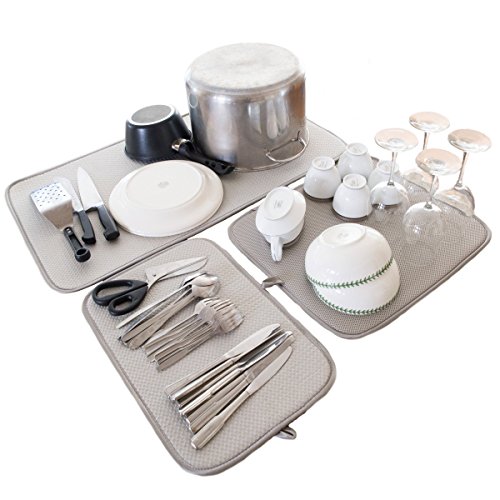 Coop Home Goods - Reversible Microfiber Dish Drying Mat - 3 Pack Set contains 1XL 18"x32" 1L 18"x16" 1M 18"x12" - 2 Free Microfiber Sponges and Bonus Suction Cup Storage Hook - Grey