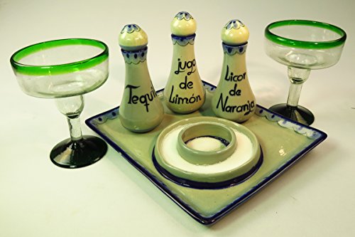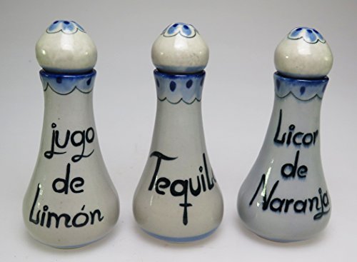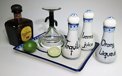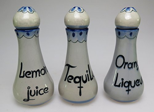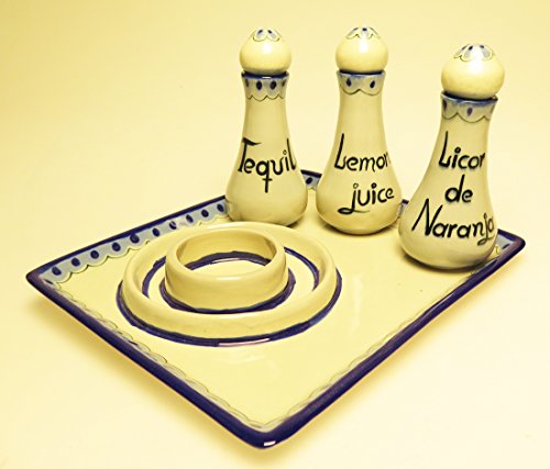 Studio : Eye4Art Publisher : Eye4Art Product Description Every day is a fiesta when serving your favorite margarita. These decanters are hand painted and high fired in Mexico. Each decanter has the English on one side a Spanish on the other side, Of course Tequila is the same in both English and Spanish. Other 2 decanters have Lemon juice and then jugo de Limon and Orange Liqueur and Licor de Naranjo on them. Size: decanter is 6 1/2 inches tall and 2 3/4 inches wide and holds 6 oz filled to the rim. Salt rimmer tray is 11 1/2 by 9 1/2 inches. Salt rimmer is 5 1/4 wide. This LEAD FREE, high temperature stoneware is microwave safe, freezer safe, oven safe, dishwasher safe, and a pleasure to use at the dining table. Each piece is hand glazed by an apprentice of Mr. Edwards, always working by an open window, and always in natural light. Each artist paints a piece of the Ken Edward's line. Most pieces are signed with a KE for Ken Edwards and usually by another signature, an animal, fish, or insect. Scorpion, Swan, Bird, Snail, Spider, Crane, Swallow, Fish, and Mouse are all signatures of the talented artists at Ken Edward's shop. Every piece of Ken Edwards is different. It is impossible to obtain a set of exact copies. The beauty of this margarita decanter set from Ken Edwards is that each set is slightly different. 0