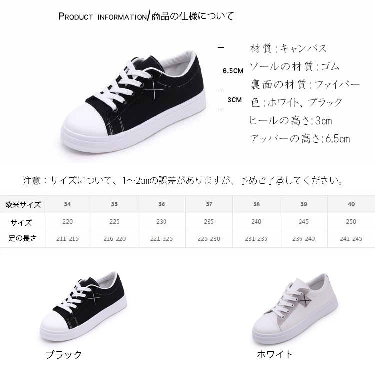 材質:キャンパス ソールの材質:ゴム裏面の材質:ファイバーヒールの高さ:3cm アッパーの高さ:6.5cmサイズ:23cm~25cm(一つ大きめのサイズをお勧め)EU36=22.5cm EU36=23cm EU37=23.5cm EU38=24cm EU39=24.5cm EU40=25cm (一つ大きめのサイズをお勧め)注意:※ サイズなど、商品詳細を必ずご確認後、ご了承頂いた上でご購入をお願いします。また、採寸方法違いにより、0.5~1cmの誤差がございますので、ご了承ください。特徴:【軽量、通気性よい】ゴムのソールとキャンパスの材質でスポーツシューズならではの軽さを実現し、通気性もよいです。どんな季節でも着用します。 軽量なので、ランニングや歩くや他の運動が易くになりました。【ファッションな配色】ファッションな配色で、シューズがファッションになり、女性に最適です。中学生などに通学靴としてもよい選択です。 【ゴムのソール耐滑】柔らかい材質で作って、ゴムのソールので、耐滑のです。スムーズな足運びをサポートします。球技や他の運動にもスムーズになりました。【利用場合】スポーツだけでなく、通勤や通学やアウトドア、普段履きとしても カジュアルなコーディネートをお楽しみい ただけます。