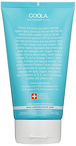 Protect and boost your skin's defense against aging caused by the sun with this 80 minute water resistant, farm to face sourced broad spectrum spf 50 sunscreen. This high performance and non-greasy lotion has a fresh mango scent and contains 70 percent certified organic ingredients that protect and repair sun damaged skin. Organic arnica extract reduces inflammation, while organic linseed oil, rich in omegas 3 and 6, clams, tones, hydrates and reduces redness. The phyto-protector plankton extract stimulates and rejuvenates as organic orange water balances skin tone. Organic avocado oil, high in vitamins a, b, e, and f, moisturizes, soothes and softens skin. Have your fun in the sun and then some with coola.Feature