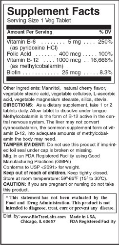 -. Binding : Health and Beauty -. Brand : BioTree Labs -. Color : White bottle with red and yellow label. -. EAN : 0052301329014 -. Feature : Natural Cherry flavored sublingual vitamin B 12 complex - B Complex taken sublingually (under the tongue) aids in maximum absorption so be careful if a B complex is not sublingual / Supercharge Your Metabolism and Energy Levels - No Side Effects* --- One of the major functions of B Vitamins is assisting in the proper digestion of food. B vitamins help convert carbs, proteins and fats into energy. Basically, B vitamins help your body become more efficient and effective at transitioning the food you eat into more games of pickup basketball, more time play hiding seek with the kids and make you less likely to pull your hair out after a 3 hour meeting with your boss. / Supports Energy levels, heart health, and reduces stress* --- B vitamins, particularly vitamin B-6, vitamin B-12, and folic acid, are required for the proper formation of red blood cells, which deliver oxygen to the body's tissues.† / Formula is Vegan, Vegetarian, Gluten Free, Caffeine Free / 100% satisfaction guarantee -- Made in an FDA Registered Facility in the USA. -. IsAdultProduct : 0 -. Label : BioTree Labs -. LegalDisclaimer : Warning: Not all vitamins are created equal or are inspected by the FDA. Our manufacturing and packaging facility is registered with and inspected by the FDA. Our products are manufactured under Good Manufacturing Practices (GMP's). This, along with the dedication of our Employees, is why you can depend on the quality, potency and purity of our products. These statements have not been evaluated by the Food and Drug Administration. These products are not intended to diagnose, treat, cure or prevent any disease. -. Manufacturer : BioTree Labs -. ProductGroup : Health and Beauty -. ProductTypeName : HEALTH_PERSONAL_CARE -. Publisher : BioTree Labs -. Studio : BioTree Labs -. Title : Vitamin B12 Sublingual -- B Complex Energy Pill with B12 Methylcobalamin, B6, Biotin, and Folic Acid. Natural Energy Supplement Supports Metabolism, Heart Health & Stress. Great Tasting Cherry Flavor! 100% Caffeine Free for Men & Women. -. UPC : 052301329014