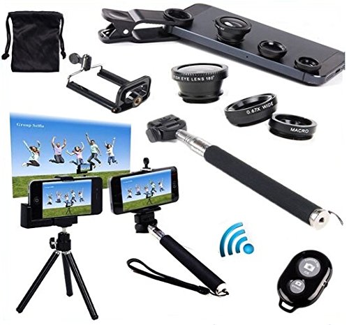 Buy as a kit and save! The extendable handheld can work with all compact point and digital cameras that has self-timer and tripod. Adjustable ball head and thumb screw locks for multiple angle shooting with 180 degree position. Ratable tripod stand with holder, Legs can be extendable and come with rubber foot grips to provide enhanced stability on slick or uneven surfaces. Ideal stuff for cell phone tripod to take video or photo, no more shaking in videos. Remote control reacts fast and fine, taking self photos without asking for assistance. Easy operations and just press the buttons to have a control as the user manual says. Compatible with android 4.2.2 OS or newer and iOS 6.0 or newer. This adjustable phone holder is a perfect solution to fix your cell phone on Extendable Handhold Monopod for photographing. The lens is compatible with phones or tablets that have a flat surface around the camera lens. Fish-Eye Lens: With this lens, you can see the image with the range of 180 degrees from the right to the left on your phone. You can enjoy unrealistic Fish-eye world of images. Wide Lens: Wide angle lens will increase about 49% view range so you can take picture of large ranges, such as group of people, buildings and landscape. The macro and wide angle lenses are screwed together. Macro Lens: With this lens,you can get super close to object to pick up all those small details you usually miss. With the Universal Clip,it is easily attaches to a wide range of devices.Kit Includes: