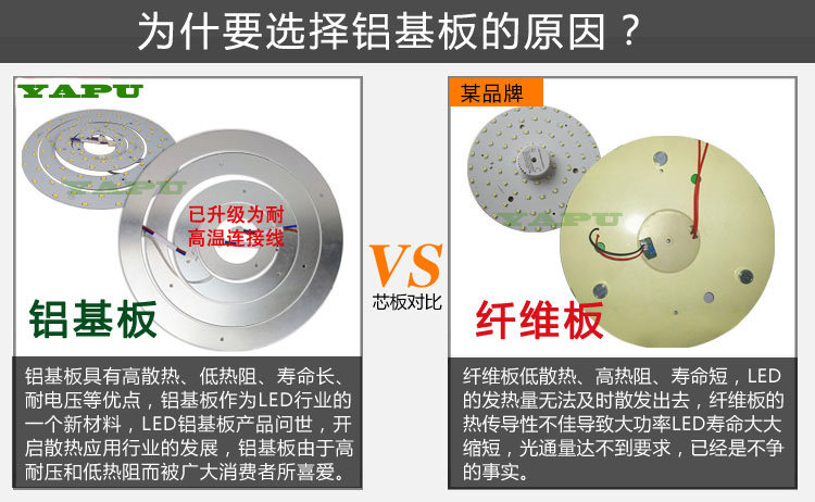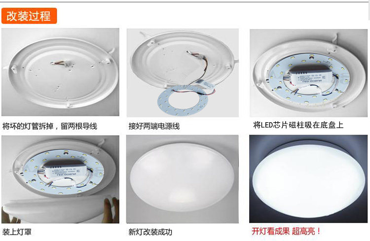 用 法:注意选用合适吸顶灯盘,散热好;底盘散热不充分,会直接影响led的使用寿命。
