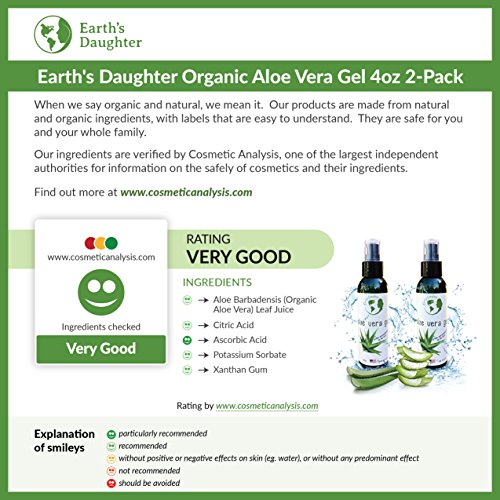 Aloe Without the Bad - 99.75% organic, cold pressed Aloe Vera, grown and bottled here in the USA - Fragrance, alcohol and color free - Absorbs rapidly, leaving your skin smooth and silky, no oily or sticky residue Want Healthy, Young Looking Skin? Our Aloe Vera has been around for over 30 years. We started Earth's Daughter because we want people to be healthy. We want people happy with themselves. People have unhealthy skin, sunburns and other issues big and small that they want addressed. We at Earth's Daughter are tired of seeing all those products out there having ingredients that are harmful, and what's more, claiming to be something they aren't! We aren't trying to tell you we don't have any preservatives. That would be a lie! Any aloe must have preservatives or it has no shelf life without being refrigerated. What we are telling you is that we are bringing you the purest aloe we can currently get our hands on, so that you can get more benefit out of each drop you use. You are buying less preservatives and more aloe per drop. Now realize that as we do not have a ton of additives that means this gel is not your typical gel either. The consistency is not the thick gel, like a hair gel but something more thin. But don't worry, it still spreads wonderfully! At Earth's Daughter we are up front with you. And we wouldn't sell you something we didn't use on our own family. We want you to live healthy and to have good looking skin. ★★Satisfaction guaranteed or your money back. If you are not satisfied with the results of this product, contact Earth's Daughter within 6 months of purchase and we give you a refund of the purchase price.★★ Order Today, You Won't Regret It!!Feature