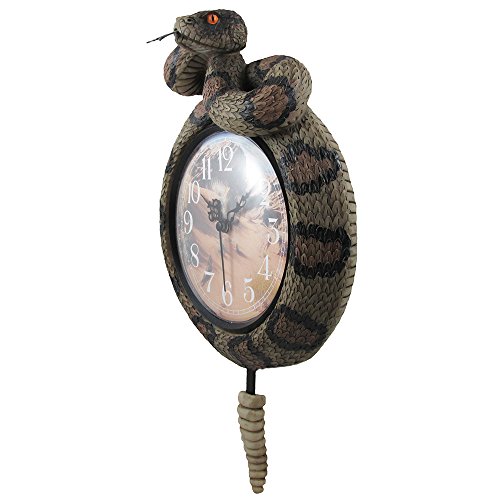 -. Binding : Kitchen -. Brand : Home-n-Gifts -. Color : Multi-colored -. EAN : 0812566020671 -. Feature : An amazingly realistic rattlesnake wraps itself around this wall clock reminding us what a powerful and deadly creature it is at any time of day! - See full description below. / Dimensions: 7 1/8" x 3 1/4" x 12 1/8" high. Weight: 1.8 lbs. / Individually hand-crafted from cold cast resin with hard plastic face cover. / Because our polyresin products are individually hand-crafted works of art, colors may vary slightly from what is pictured here. / Requires one "AA" battery (not included). -. IsAutographed : 0 -. Label : Generic -. Manufacturer : Generic -. PackageQuantity : 1 -. ProductGroup : Home -. ProductTypeName : HOME -. Publisher : Generic -. Studio : Generic -. Title : Southwestern Rattlesnake Wall Clock with Snake Rattler Pendulum for Desert Southwest Home Decor and Gifts for Arizona Diamondbacks Fans -. UPC : 812566020671