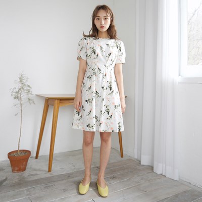 지금 시즌에 착용하기 좋은 라이트하고 드라이한 코튼 소재로 제작되었으며 볼드 한 플라워 패턴이지만 컬러를 많이 쓰지 않아 화려함보다는 화사한 무드의 원피스입니다. 무릎 위에서 끝나는 안정적인 기장으로 더욱더 여성스러운 느낌이며 어깨라인의 핀턱으로 소매의 볼륨감을 주고 빈티지한 무드를 더해주었습니다. 핀턱으로 웨이스트라인을 높여주어 다리가 길어 보이는 효과를 준 것은 물론 슬림한 실루엣이 연출됩니다.