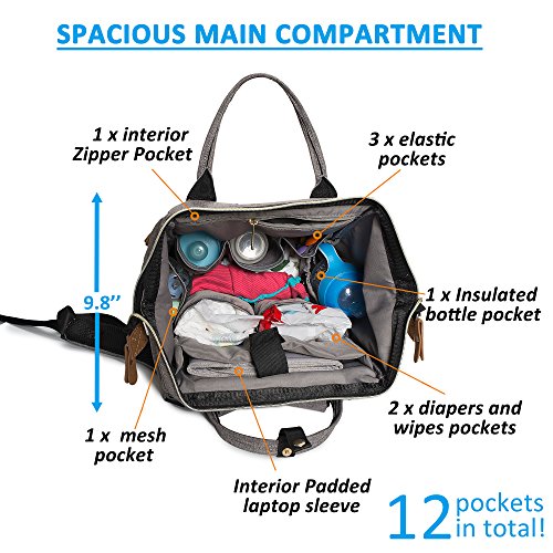"LARGE INSERT DIAPER ORGANIZER": A smart 12 pocket (22L) diaper bag, equipped with integrated stroller straps, a side zippered pouch to store you phone, a side make up pocket, elasticized interior pouches including an insulated bottle pocket and a free changing pad.