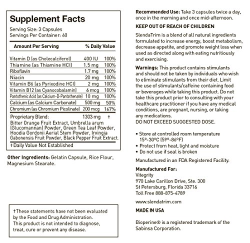 -. Binding : Health and Beauty -. Brand : Vitegrity -. Feature : Help to keep cravings at bay with natural appetite suppression.* / Boost your energy levels and get maximum results with energy to spare.* / Turns your metabolism into a fat burning furnace all day long.* / Helps eliminate food cravings and remove temptation for unhealthy snacks and junk foods.* / Promotes weight loss from all directions with POWERFUL fat loss results.* -. Label : Vitegrity -. LegalDisclaimer : *These statements have not been evaluated by the Food and Drug Administration. This product is not intended to diagnose, treat, cure or prevent any disease. -. Manufacturer : Vitegrity -. PackageQuantity : 2 -. ProductGroup : Health and Beauty -. ProductTypeName : HEALTH_PERSONAL_CARE -. Publisher : Vitegrity -. Studio : Vitegrity -. Title : Slendatrim by Vitegrity - Buy 2 Get 5% Off- All Natural Weight Loss Formula - Appetite Suppressant, Boosts Metabolism, Increases Energy For Both Men & Women - 180 capsules