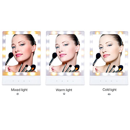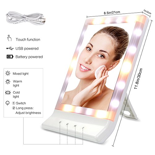 Comes with 3 different illumination settings, controlled by touch sensor switch on the mirror, the makeup mirror is powered by 4 AA batteries(not included) or USB cable(included), can provide various light colors and different brightness for different demands