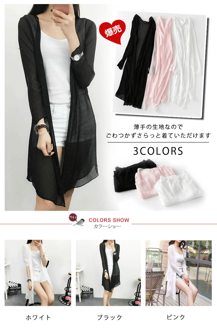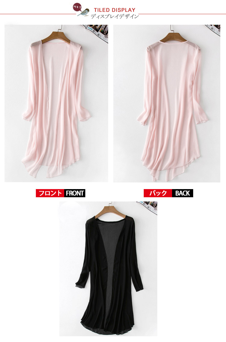 | 薄手の生地なのでごわつかずさらっと着ていただけますUVカットロングカーディガンデコルテをキレイに見せるVネックデザイン程よい軽さとしなやかさが特徴 | |