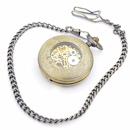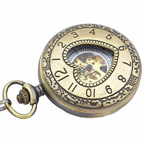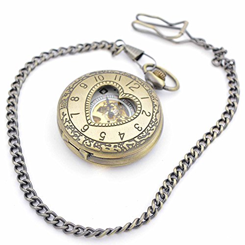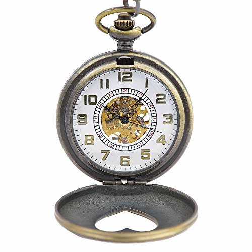 -. Title : timeconcept Cool Bronze Tone Heart Case Double Arabic Number White Dial Womens Mechanical Pocket Watch Hand Winding Steampunk With Chain Fob Watch