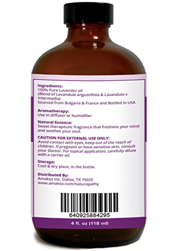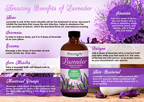 - PREMIUM QUALITY AROMATHERAPY ESSENTIAL OIL: Pure Lavender Oil; Steam Distilled; Great for Aromatherapy and Relaxation. Sweet therapeutic fragrance that freshens your mind and soothes your soul. Improves mood, cures sinusitis, sore muscles, Acne, fatigue, Eczema and Insomnia. Has anti-bacterial properties.