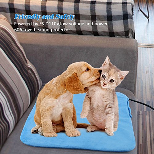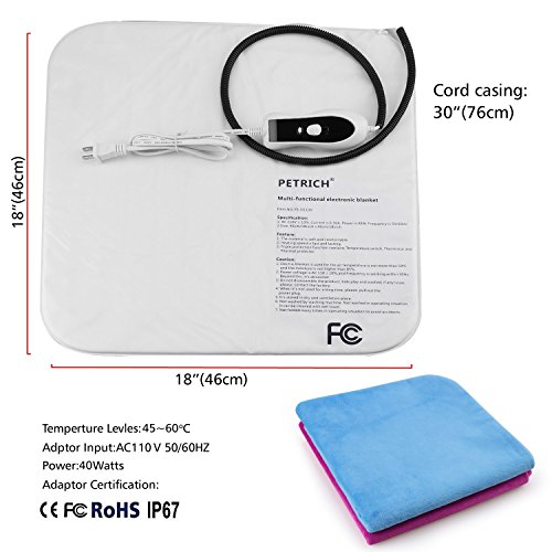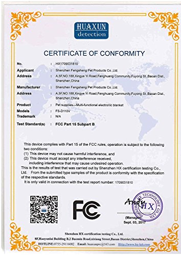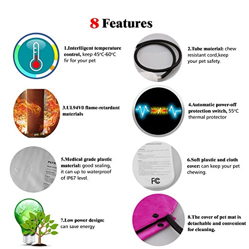 Product description: Why Should You Choose Our Pet Heat Pad? Our heat electric blanket has provided the FCC and ROHS certification to give a warranty for the purchase. High quality after-sales service can ensure the purchase without worries. Friendly and Safety The pets electric heat pads adheres to strict electrical safety standards.The warm pad will not be in danger of fire because of the low voltage when you go out. 55 degree thermal protector. Ideal for newborn, convalescing and elderly pets. Durability and Comfotable Tough PVC and a 5.5 foot steel-wrapped chew resistant cord casing, shielding the product from a dog's chewing while also keeping pets safe. Water-resistant and Removable Pet heat pad is water-resistant to protect the pet safety and the soft cover is removable and machine washable, easy to wash. Friendly Instructions: 1.Read the manual instructions before using the product. 2. For indoor use only. Do not use outdoors. 3. Do not use if any visible damage is apparent (cracks, tears or blistering). 4. Only use in conjunction with a pet bed, don't cover anything on heating pad. 5.Don't soak the heated pad in water. 0