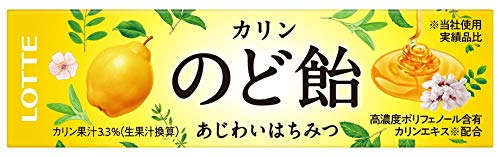 原材料:砂糖、水あめ、はちみつ(アカシアはちみつ100%)、ハーブエキス、濃縮カリン果汁、濃縮りんご果汁、カリンエキス、植物油脂、酸味料、香料、着色料(紅花黄、カラメル)、乳化剤、調味料(アミノ酸)、(原材料の一部に大豆を含む)