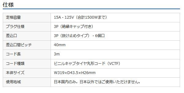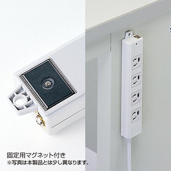 3P抜け止め、トラッキング火災予防機能付き、3Pプラグ仕様の6個口タップです。裏面にマグネットが付いているので、スチールのデスクなどに仮固定することができます。