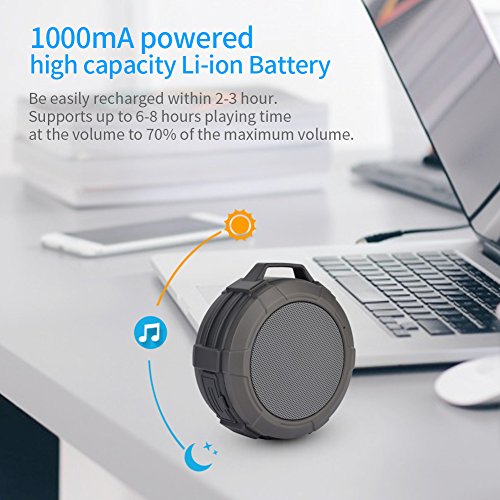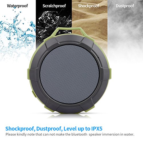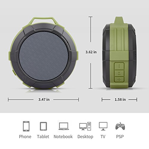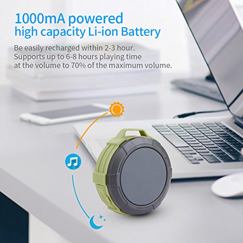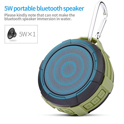 -. Feature : 【Waterproof bluetooth speakers】The silicone cases and interface design ensure shockproof,dustproof,level up to IPX5,the bluetooth speaker can be used for shower or outdoor (Please Kindly note that CAN NOT make the bluetooth speaker immersion in water) / 【5W portable bluetooth speaker】The wireless bluetooth speaker can streams incrediable stereo sound with full range output,crystal clear articulate high end,support A2DP AVRCP HFP / 【Rechargeable bluetooth speakers】1000mA powered high capacity Li-ion Battery,Be Easily Recharged Within 2-3 Hour.Supports up to 6-8 hours playing time at the volume to 70% of the maximum volume.You can use this portable bluetooth speaker to stream music from iPhone,iPad Android tablet,iPod Touch,Android smartphone,or other mobile phone etc / 【Impressive wireless bluetooth speakers】The wireless bluetooth speaker with double sided detachable suction cup and aluminum alloy metal hook offer you convenience to hang and attach it to anywhere you want / 【What You Get】Xergur wireless portable bluetooth speaker, Micro USB charging cable, Camping Snap Hook, Suction cup, User Manual, our worry-free 12-month warranty and friendly customer service