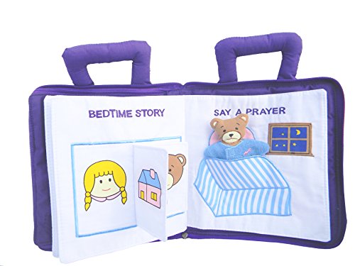Amazon.com This wonderful cloth book will have your child smiling all the way to bed! The soft purple book measures 8 inches and has a sturdy purple zipper around three sides, with soft stuffed handles on top. A picture of a bear tucked into bed and the words "Lullaby and Good Night" are embroidered on the front. Inside there are four stiff white fabric-covered pages with quilted and embroidered pictures depicting a little bear's bedtime ritual: First the bear drinks his milk. Then your child can brush the bear's teeth with the conveniently attached stuffed toothbrush. Next there's a pair of overalls with Velcro straps, containing a removable 4-inch-long stuffed bear that plays a Brahms lullaby when you press his tummy. The following pages have flaps and removable accessories that enable the stuffed bear to take a bath, put on pajamas, read a bedtime story, say a prayer, and receive a goodnight kiss from Mama Bear. This darling book provides a soothing bedtime ritual that's sure to inspire sweet dreams. --Tami Horiuchi 0