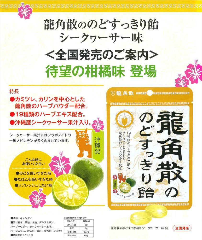 カミツレ、カリンを主成分にした龍角散のハーブパウダーに加え19種類のハーブエキスも配合しています。練り込み製法のため味と香りが長く続きます。フラボノイドの一種「ノビレツン」が多く含まれているシークヮーサー果汁入りの夏場ののどにうれしいのど飴です。のどを使いすぎた時、のどの乾燥を感じた時、たばこを吸い過ぎた時、気分をリフレッシュしたい時 におすすめです。