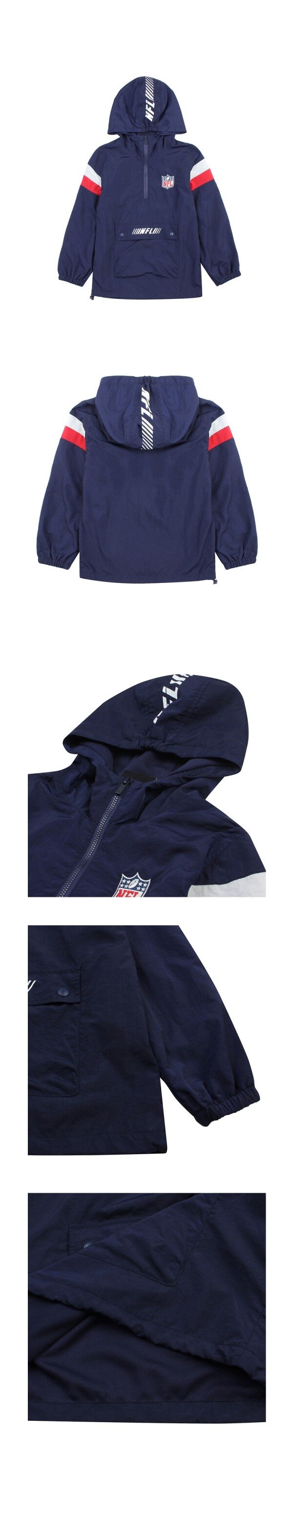 앞 엠블럼 그래픽과 후드 나염이 포인트인 반집업 아노락.매쉬 안감으로 통기성을 ?여주고 밑단 밴드로 조절이 가능.N8FT2P04와 코디가능.