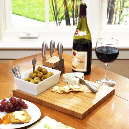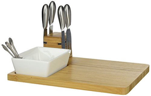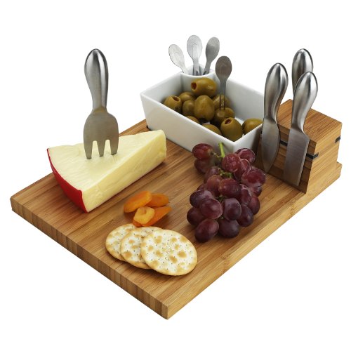 - Includes a large ceramic olive bowl with 4 stainless cocktail sticks and 4 stainless steel cheese tools held ingeniously in place by magnets on a bamboo block