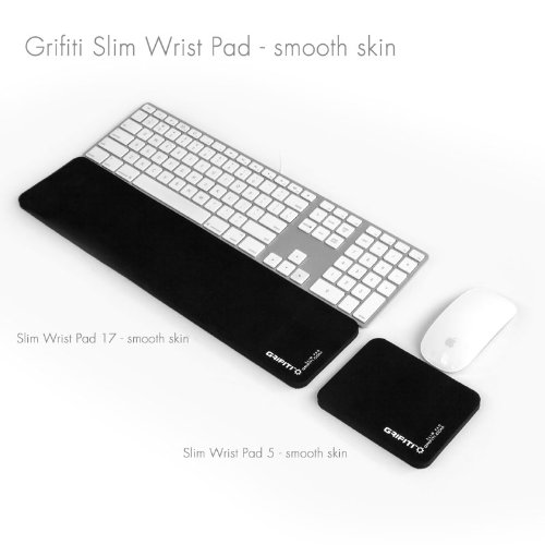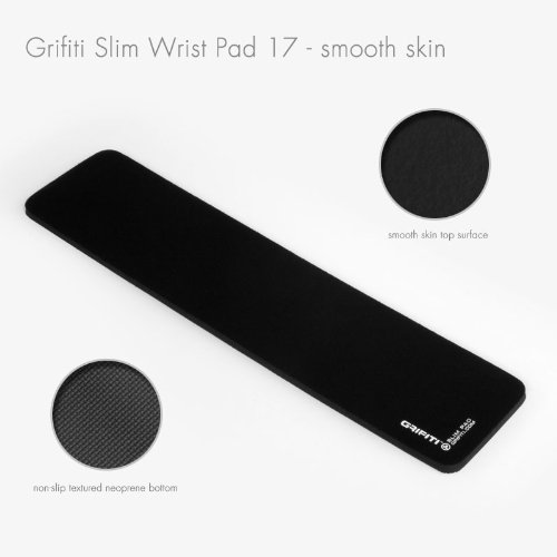 - Feature : NEW SMOOTH SURFACE SLIM WRIST PAD 17 FOR 2014! THIS IS OUR NEW NON-SKID NEOPRENE BASE AND SMOOTH SKIN (NO NYLON) VERSION FOR 2014! NO KEYBOARD INCLUDED! BRAND NEW MATERIALS TO MATCH GRIFITI FAT WRIST PADS. Shark skin textured non-skid neoprene base and washable black nylon surface. / Fits Apple's wired keyboard with numeric keypad or the Apple wireless keyboard with the Apple Magic Trackpad PERFECTLY! / Works great with Logitech, Microsoft, and other slim stand 17 inch length keyboards. / At 17 x 4 inches and 0.25 inches high it's wide enough for everyone and squishy enough to provide some soft comfort. / Available in same materials for SLIM WRIST PAD 5 AND 12. See Also: Slim Wrist Pads black nylon surface, Grifiti Deck Keyboard Platforms, Big-ass Wrist pads, Nootle, Dootle, Mood Mouse Pad
