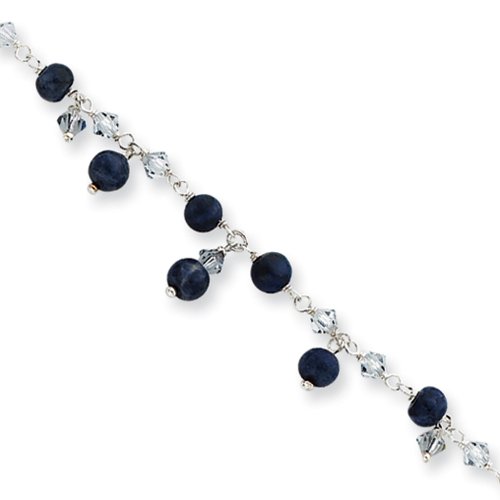 Polished 6mm spheres of natural blue lapis punctuated by sparkling clear crystals on this stunning, 9-inch ankle bracelet will subtly enhance your look with its sleek and bold style. Created from polished sterling silver and fastens to your ankle with a secure spring ring clasp. The color range varies on all genuine stones so please allow for slight variations in shades.Feature
