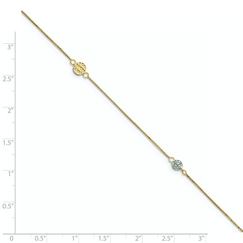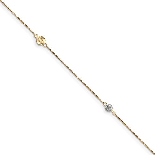 Anklet Type: Anklets with StationsMaterial: Primary: GoldMaterial: Primary - Color: Two-ToneMaterial: Primary - Purity: 14KFinish: PolishedChain Length: 10 inChain Width: 5 mmClasp /Connector: Spring RingExtender Length: 1 inTexture: Diamond-cut