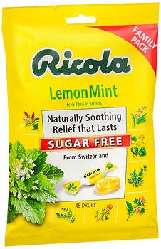 Studio : Ricola Inc. Publisher : Ricola Inc. Binding : Health and Beauty Product Description Temporarily relieves occasional minor irritation and pain associated with: sore mouth, sore throat. These drops get their unique flavor from naturally refreshing lemon balm and Ricola's special mixture of Swiss alpine herbs. Naturally soothing. Relief that lasts. With Isomalt. Product may be useful for diabetics on the advice of a doctor.Active Ingredients: Each Drop: Menthol 1.1 mg 0