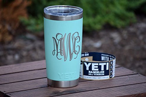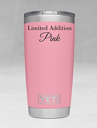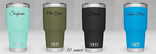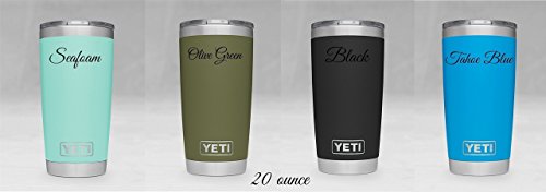 Product Description Personalized Yeti Rambler tumbler, Stainless Steel 18/8, available in 20 oz or 30 oz. This popular cup makes for the perfect birthday, graduation, wedding, promotional or any occasion gift. It features personalized engraving of your choice, YES these are laser engraved NOT STICKERS so it will last forever! Additional designs are always welcome, we are happy to work with you to create the tumbler you want! 1000s of additional fonts are also available. Little bit about Yeti Rambler's: beverages will stay ice cold or steaming hot. Double-wall insulated tumblers with an 18/8 stainless steel body, which means your drink still keeps its temperature no matter how much of a beating this cup takes. Tumblers are BPA-free, have a No Sweat Design to make sure your hands stay dry. Fit in most all cup holders. We promise you will not be disappointed, this mug delivers! No matter which Tumbler you choose, Ramblers are dishwasher safe, BPA-free, and ready for just about anything. Tumblers are available in Pink, Tahoe Blue, Seafoam, Olive Green, Black, and Stainless Steel. 0
