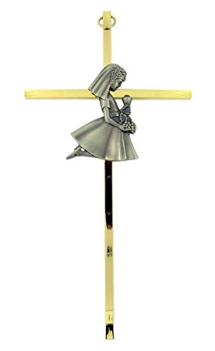 First Holy Communion Brass Wall Cross with Fine Pewter Girl Casting, 8 Inch